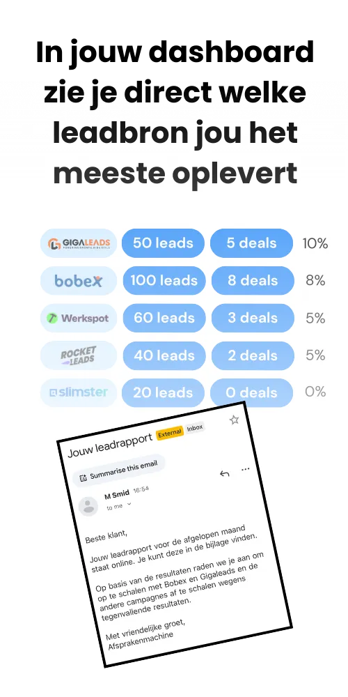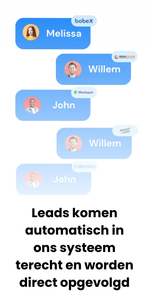 We werken al jarenlang met leads van bekende offerteplatformen zoals Solvari, Offerte.nl en Bobex, maar ook met grote leadgeneratoren zoals NXT Brand en Gigaleads. We kennen hun kwaliteit, hun tempo en hun uitdagingen — en weten precies hoe we die leads het snelst omzetten in afspraken.